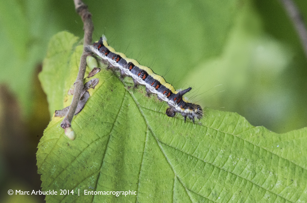 As I ambled on up the hill towards the railway crossing I found this little fella munching on hazel. This is the caterpillar of the Grey Dagger Acronicta psi. The dagger moths get their names from the small cross or dagger-like markings on the forewings.